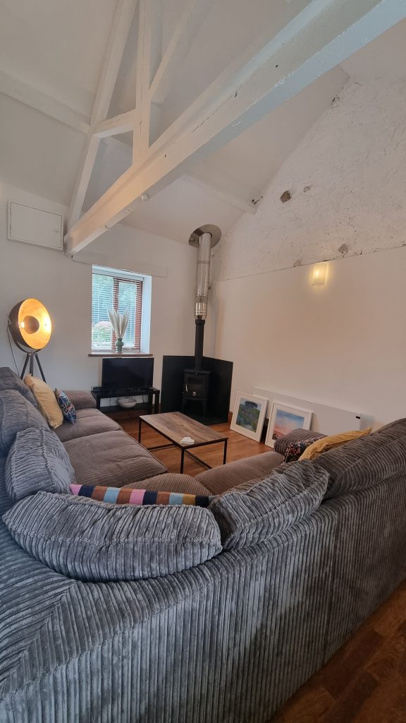 Cozy lounge with spacious corner sofa and inviting log burner, perfect for curling up and unwinding.