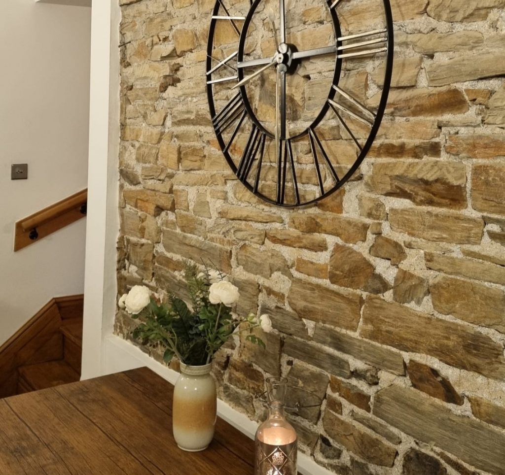 A spacious kitchen with abundant cooking amenities, 4-seat dining table, garden-view windows, and a striking stone feature wall.